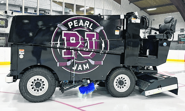 Pearl Jam designed its own art for the Jamboni, which is black with the band’s name on the side. A “PJ” in the school colors has hockey sticks crossed behind it.