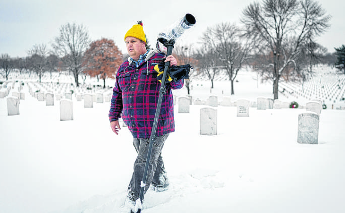 Following deep footprints, Benson crunches up the snowy hill, through a walkway lined by military gravestones, tailing the troop of news reporters and photographers he invited to record his routine this day.