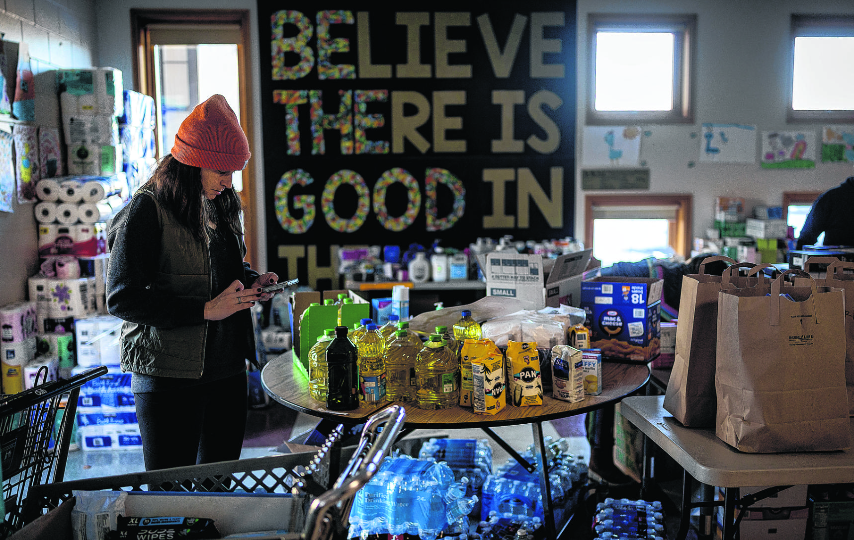 The surge of donations quickly outgrew co-founder Sheighlyn Berbig’s home playroom, and donated goods are now stacked in several basement rooms at Anoka United Church of Christ. There, volunteers rotate through shifts, packing bags of food and supplies that social workers and partner organizations deliver directly to families.